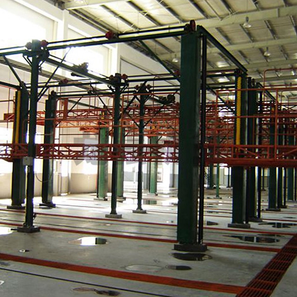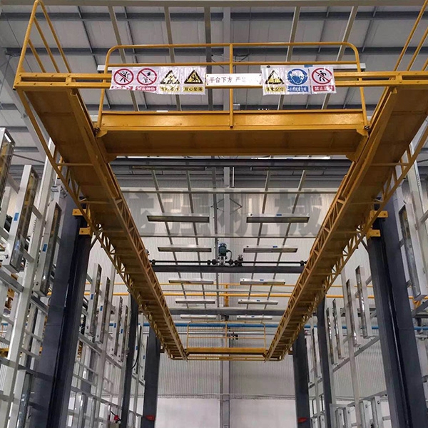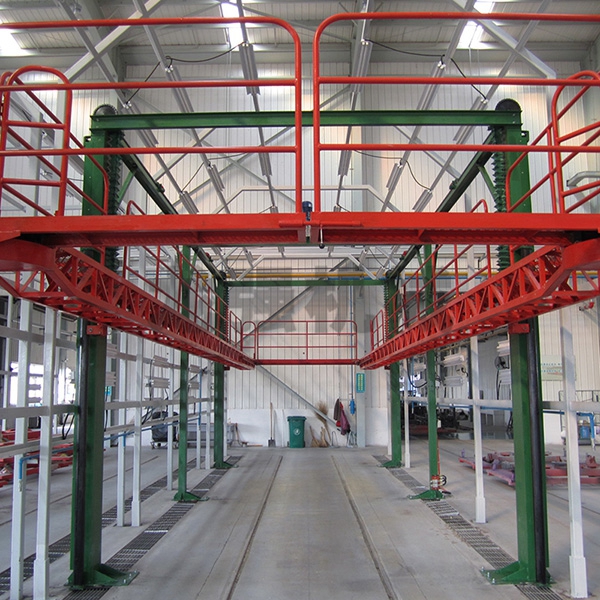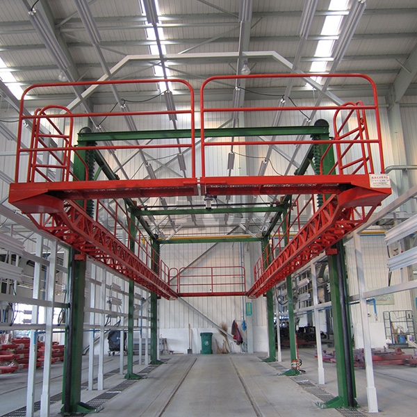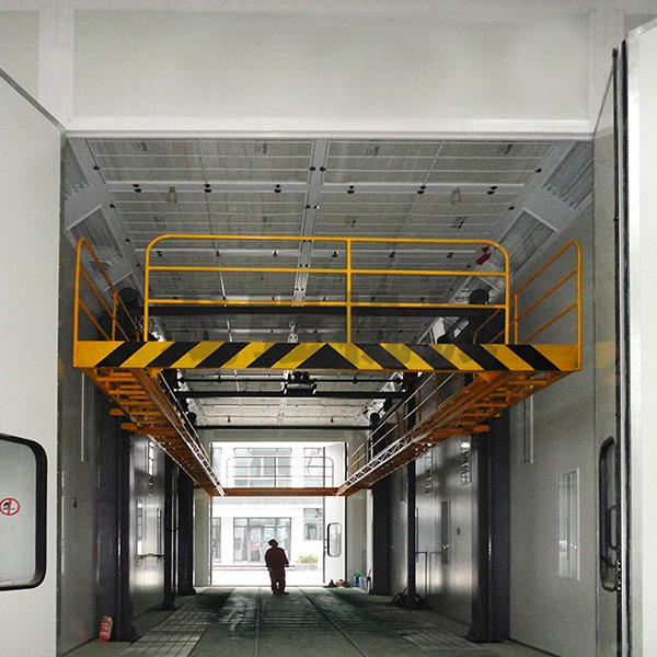本设备系采用电机连接减速机减速后,通过多轴及链轮、链条的机械传动方式改变运动方式,以导向柱导向轮等组成的导向机构,使得操作平台升降过程的相对稳定和整机刚性,在边立柱的链条一端加配重锤,以减少电机工作负荷,减少振动幅度,以达到平台升降平稳的目的,并在平台贰端设有移动小车,以适应不同车长的需要。采用钢丝绳保险装置,钢丝绳两端分别与平台及配重锤连接。当链条发生断裂时,因钢丝绳与平台配重锤连接不至于平台突然下坠,以便操作人员能及时调整平台,从而使得操作人员的人身健康。